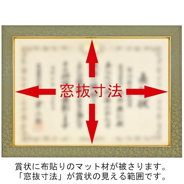 A3(297×420)・七五(303×424)・六七(310×435)・大賞(318×439)といった複数の賞状に共通でお使いいただけます。窓抜寸法(額縁に納めたとき、賞状が見える部分の寸法)と、お手元の賞状の大きさを比べてください。窓抜寸法は「290×412」ミリです。290×412の周りには、布張りのマットが被さって隠れることになるので、お手元の賞状の文字などが隠れてしまわないかお確かめください。