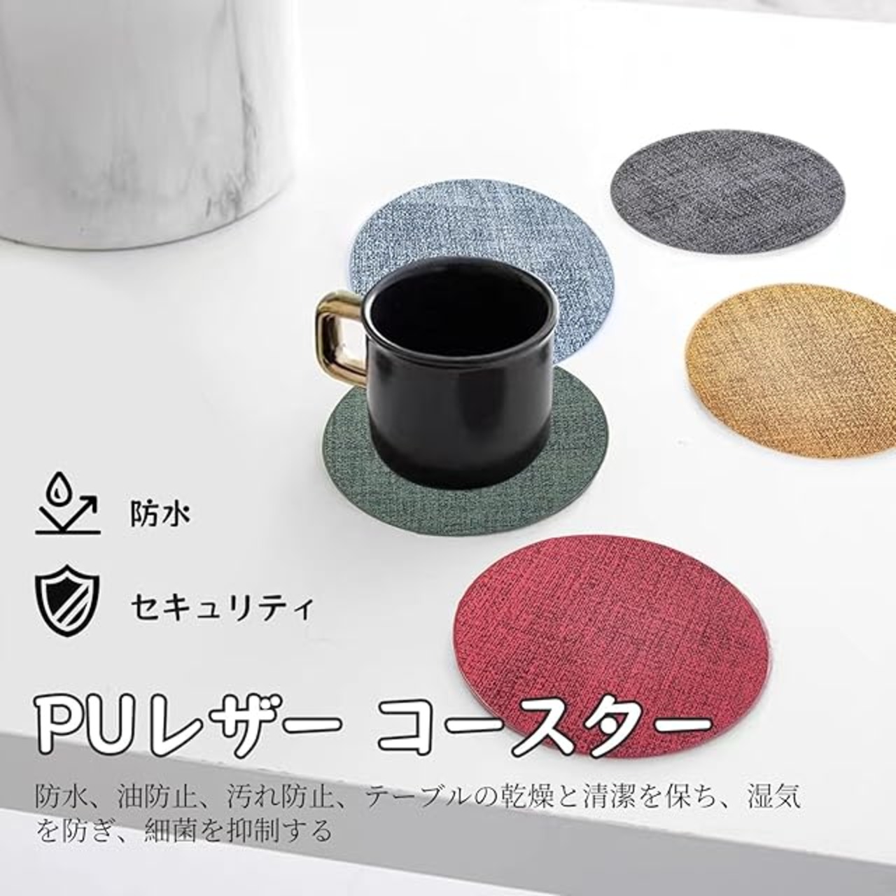 <p>【コースター】コースターはシンプルでスタイリッシュなデザイン、シンプルなデザインでインテリアに取り入れやすい、防水、油防止、防汚、机の乾燥や清潔を保ち、湿気を防ぎ、細菌を抑えます。使用後、デスクトップに跡は残りません。テーブルとの摩擦を効果的に減少し、家具をより良く守れます。</p><p></p><p></p><p></p><p>【高品質の素材】コースターは高品質なPUレザー素材で製作、柔らかく、耐久性、安全で、無毒で、環境に優しいので、安心して使ってください。変形しにくく、柔軟性に優れ。摩擦が大きく、滑りにくい、色褪せしにくく、長時間の利用が可能です。お手入れが簡単、デスクトップをきれいに保ちます。</p><p></p><p>【商品のサイズ】サイズ:直径:10 cm、適切なサイズで、多くのサイズのものを置くことができます。コップ、コーヒーカップ、ワイングラス、湯飲みなどはもちろん、洗面台の上に置いてうがいコップやシャンプーなどの用品を置くこともできます。</p><p></p><p>【幅広い用途】ローキートーンのカラーとオシャレなデザインで、リビング、キッチン、寝室、オフィス、バーやレストランに適しています。御挨拶、引越し、贈答、新築、祝用、誕生日、記念日、、卒業などに、ご家族やお友達、上司、先生への素敵なギフトとしてオススメです。</p>