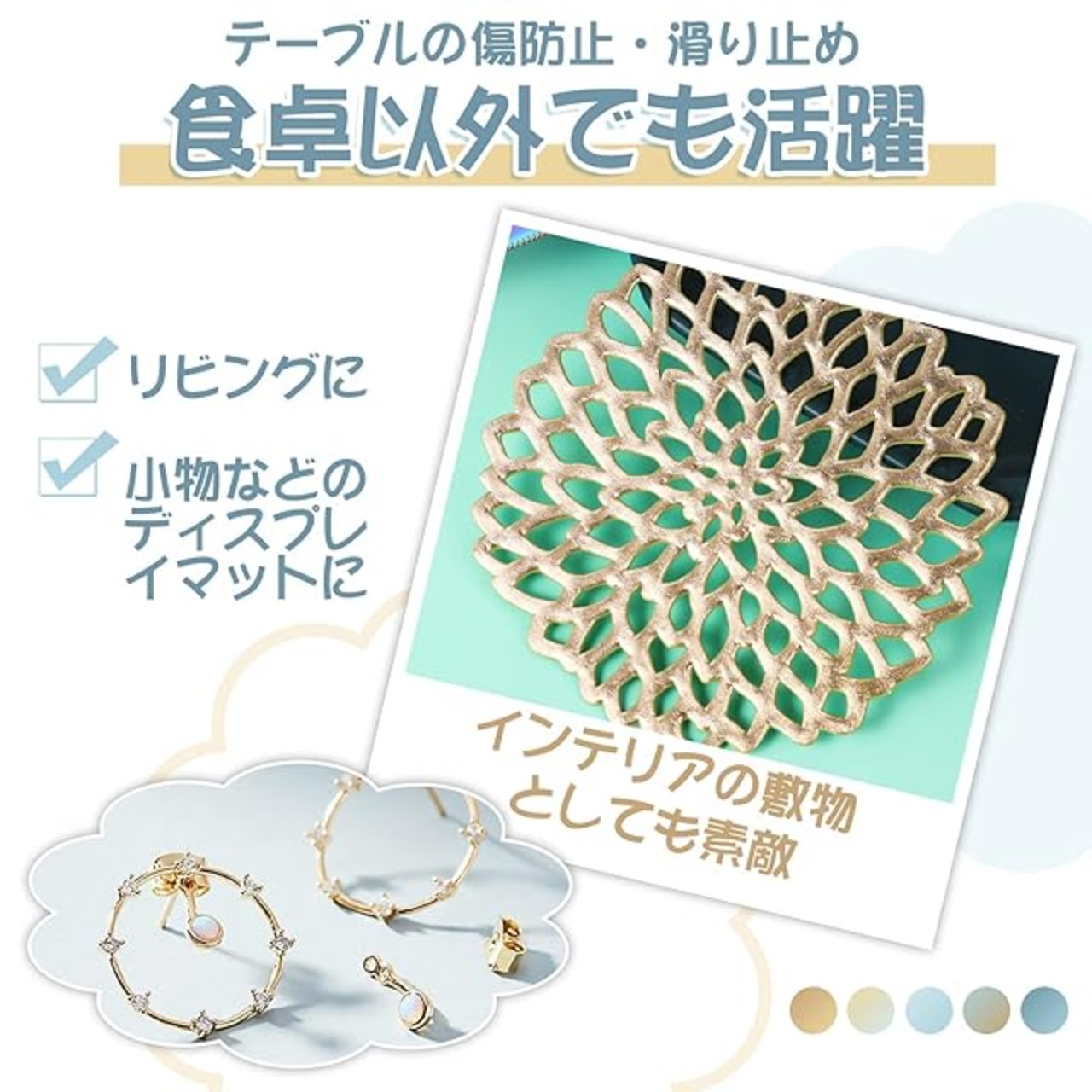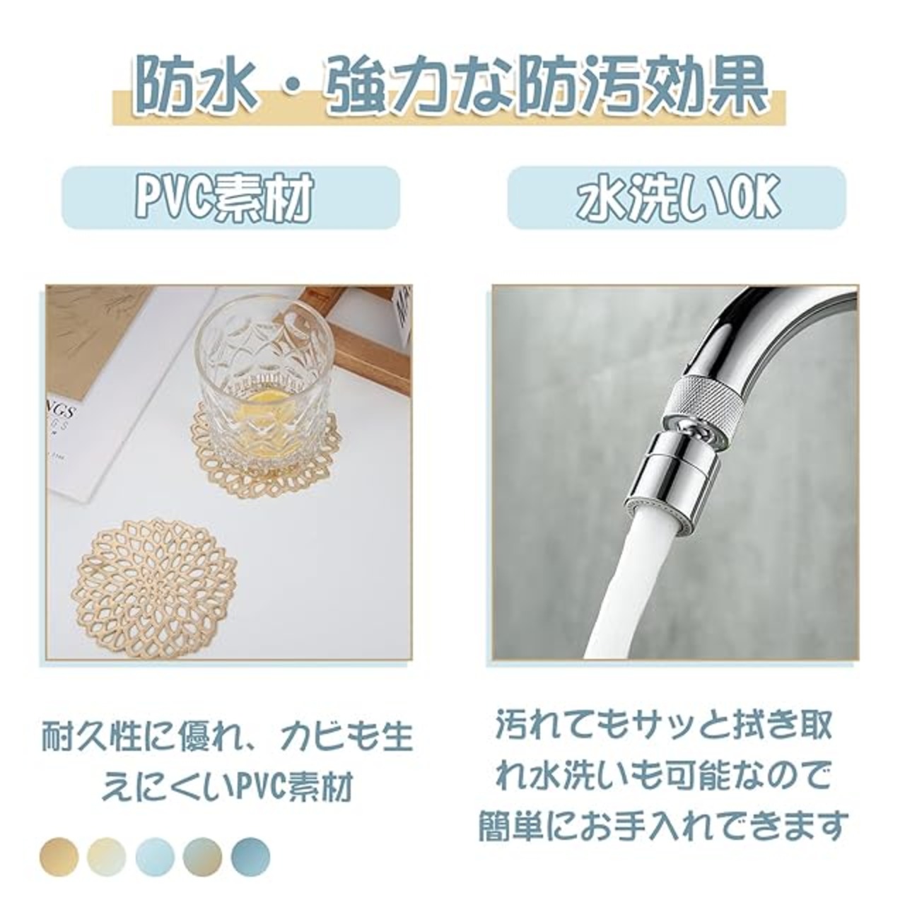 【素材】コースターはPVC素材で作られています。防汚、耐久性に優れ、汚れてもサッと拭き取れ水洗いも可能なので簡単にお手入れできます。コースターは再利用できます
