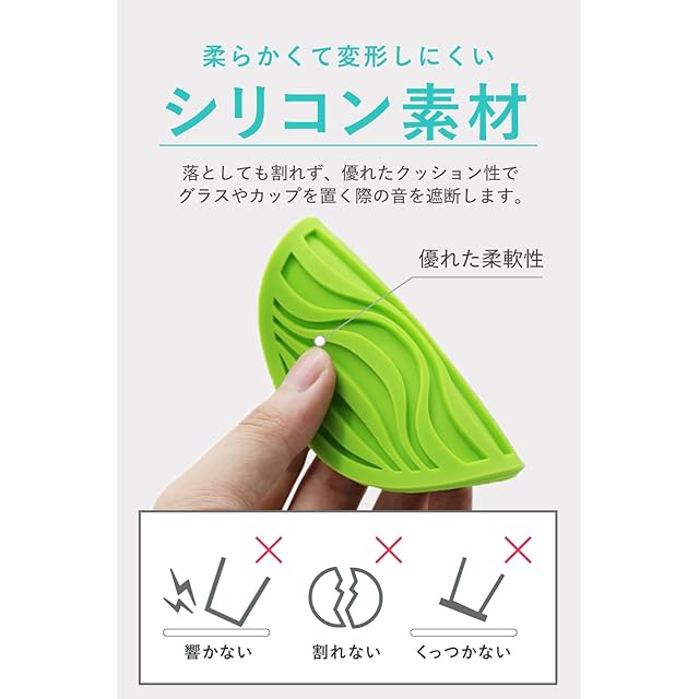 【④安心のシリコン素材】落としても割れず、優れたクッション性でグラスも机も傷から守ります。