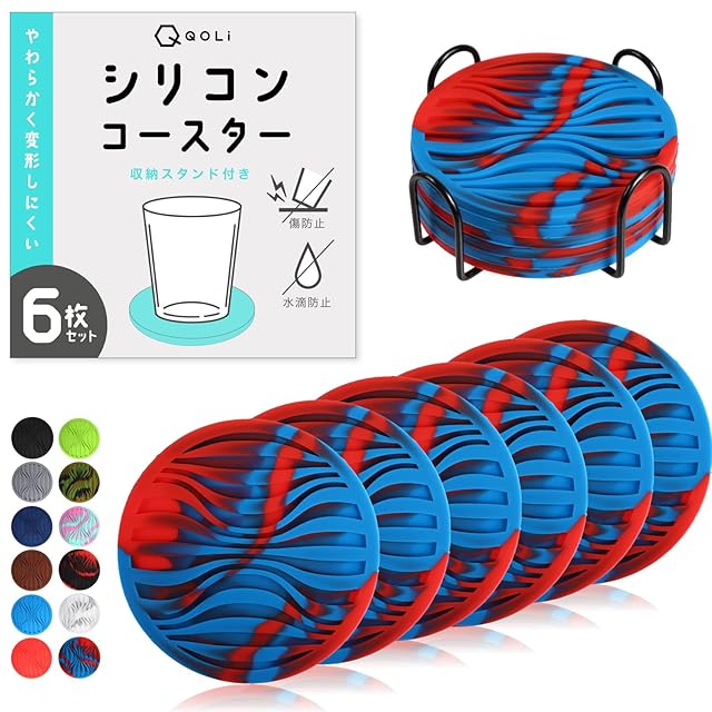 商品名:【耐久性&簡単お手入れ】 シリコン製 コースター 6枚セット 収納ケース付き 立体構造 水滴受け止め 滑り止め クッション性 傷防止 直径10cm (レッド&ブルーマーブル)
