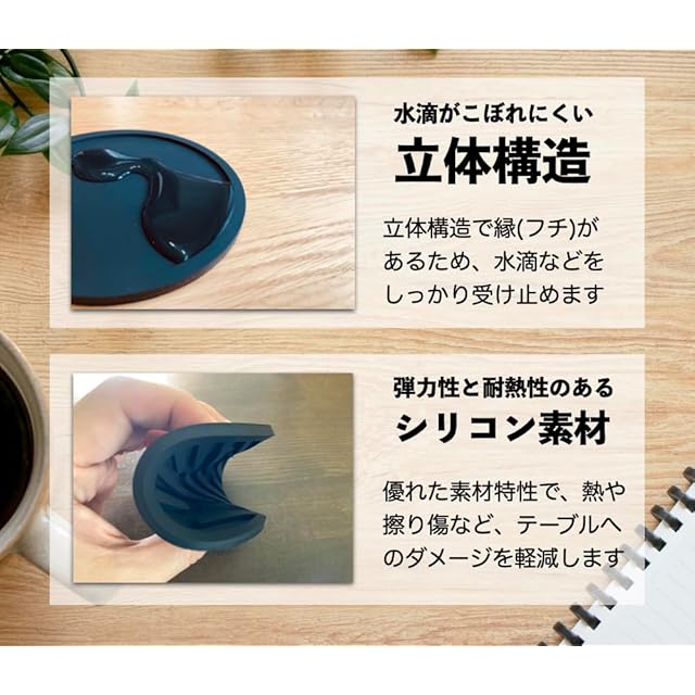 ✅耐熱性のあるシリコンコースターは、熱いコーヒーや紅茶の入ったカップの熱から大切なテーブルやデスクを守ります。また、シリコーン素材は柔軟性があるため、硬いマグカップやコップ、ワイングラスの底面などが擦れてテーブルやデスクの表面を傷つけることも防ぎますので、活用することをおすすめします