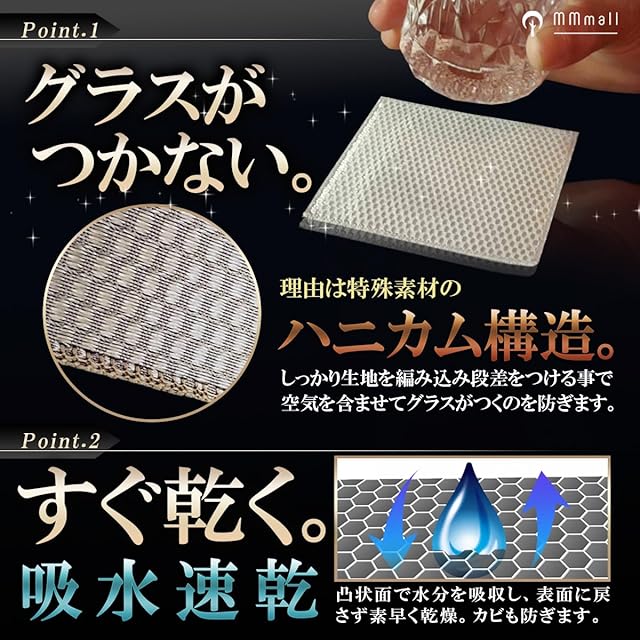 【スナック,ラウンジ,キャバクラ,で使える高級感のあるコースター】見た目はシンプルでなおかつ高級感のあるコースターです。洗練されたカラーリングが夜のお店の華やかさを演出します。日本の職人により一つ一つがしっかりと作りこまれてます。【Point① グラスがつかない!!】特殊な素材でできたハニカム構造。しっかり生地を編み込み段差をつける事で空気を含ませてグラスがつくのを防ぎます。【Point② テーブルまで水を通さない!!】裏生地はラバー素材なのでグラスの外から出る水分をしっかりキャッチ。テーブルやカウンターを濡らす事無くお使いいただけます。【Point③ テーブルからずれない】裏生地がラバーなので滑り止め効果があります。酔ったお客様が万が一コースターを滑らせて足元や胸元にグラスの飲み物こぼすといったトラブルの軽減になります。【Point④ 吸収性に優れ,乾燥も早い!!】通常の布系のコースターだとなかなか乾かない為にカビなどの原因で臭くなりやすいのですが、このコースターは乾燥が早く耐久性にも優れています。