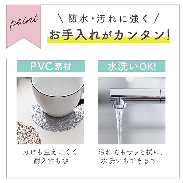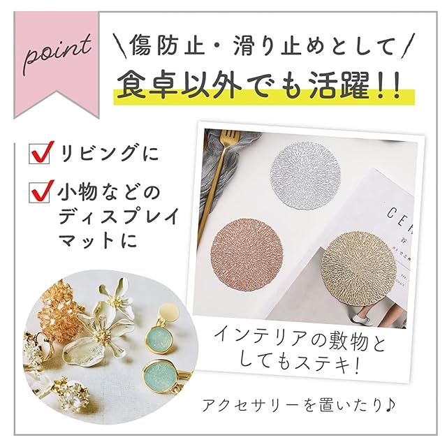 テーブルの傷防止や滑り止めなどの実用性にも優れ、食卓以外の場所でもさまざまな物の敷物として役立ちます。