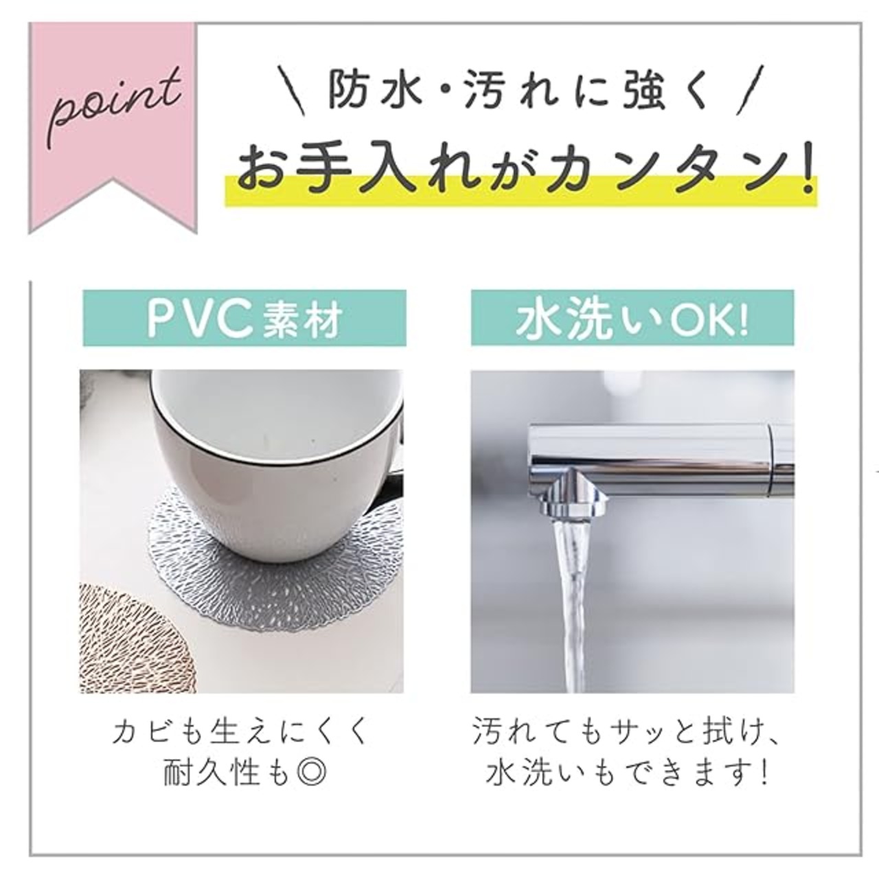 防水・防汚・耐久性に優れ、カビも生えにくいPVC素材。汚れてもサッと拭き取れ水洗いも可能なので簡単にお手入れできます。