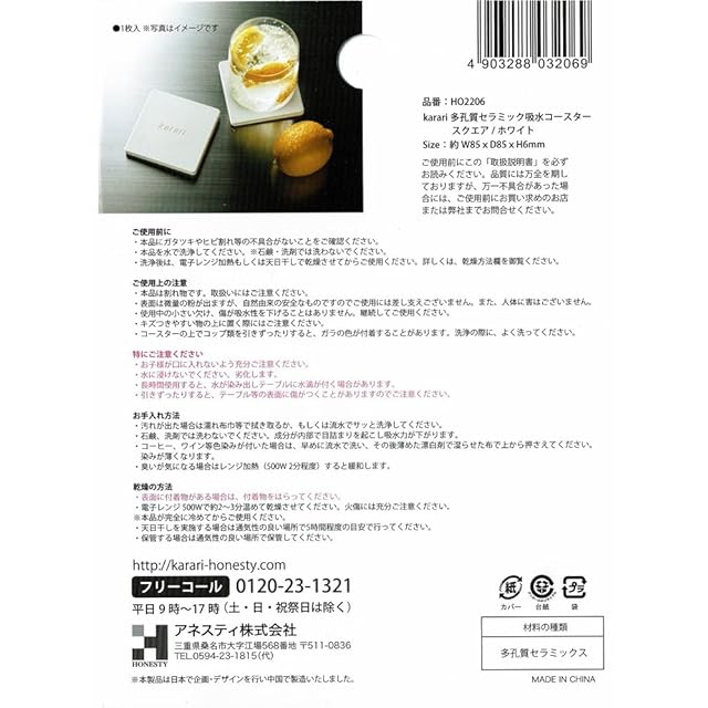商品名:アネスティ 多孔質セラミック コースター 約縦8.5×横8.5cm ホワイト karari 角型 スクエア 吸水 速乾 HO2206