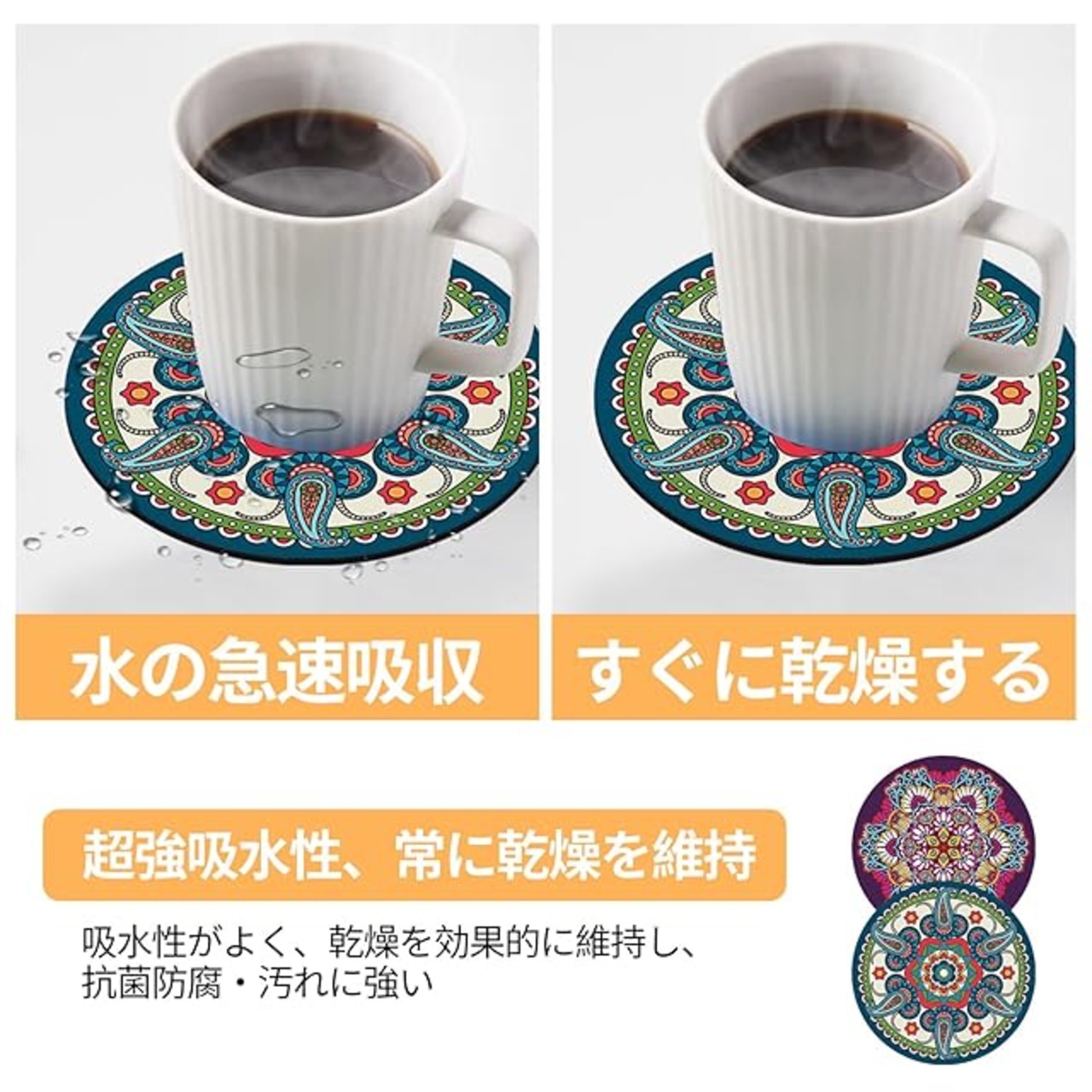 【高い吸水性】コースターは吸水性の高い素材で作られており、コップの底の水を効果的に吸収し、デスクトップが濡れるのを防ぎます。 また、お手入れも簡単で、湿らせた布で軽く拭くだけで汚れが落ち、デスクトップがすっきりします。