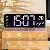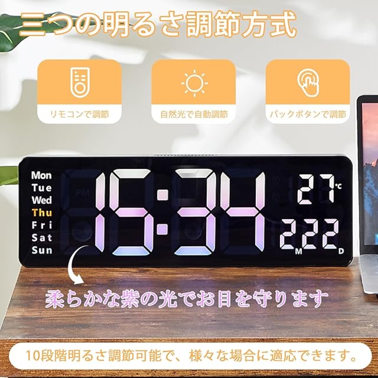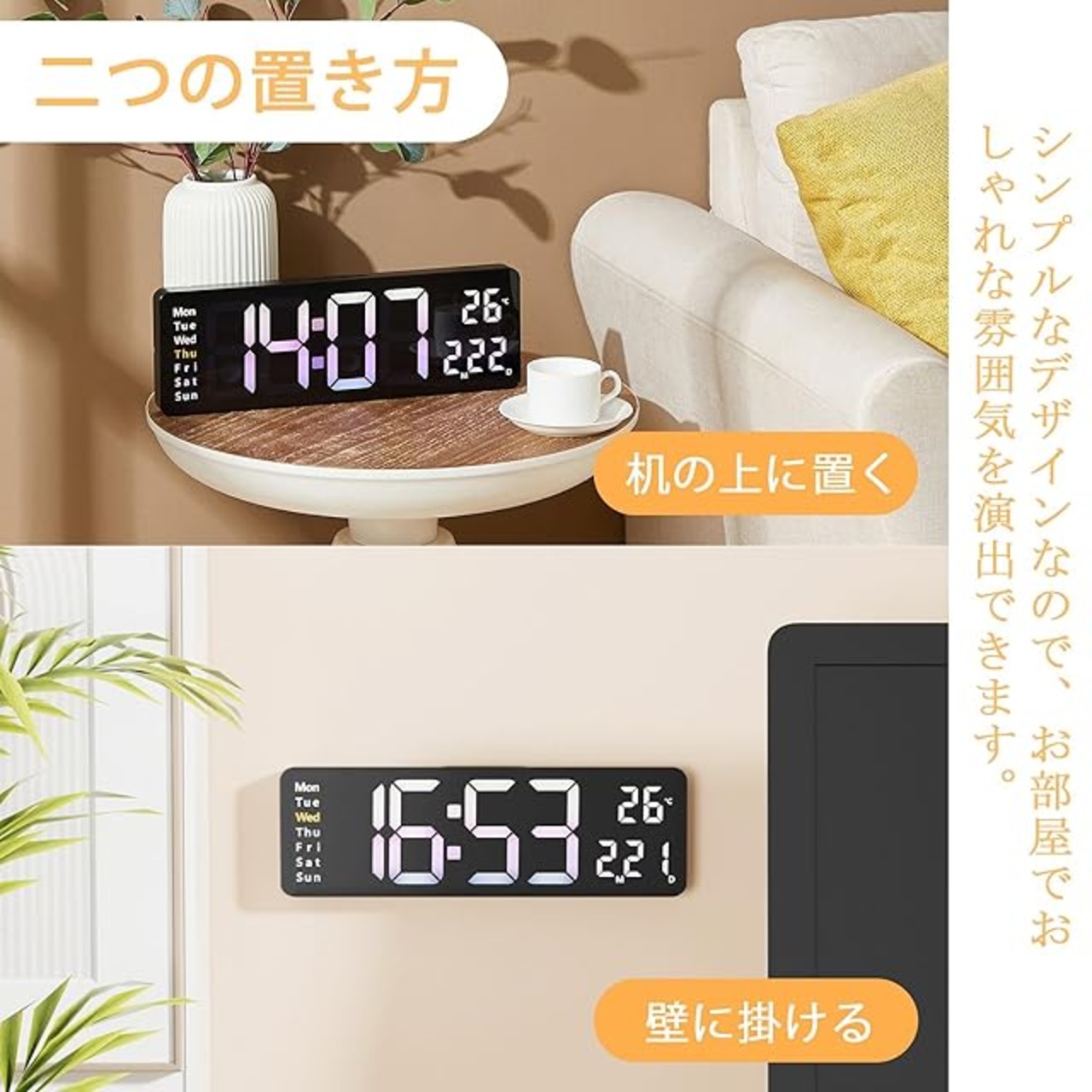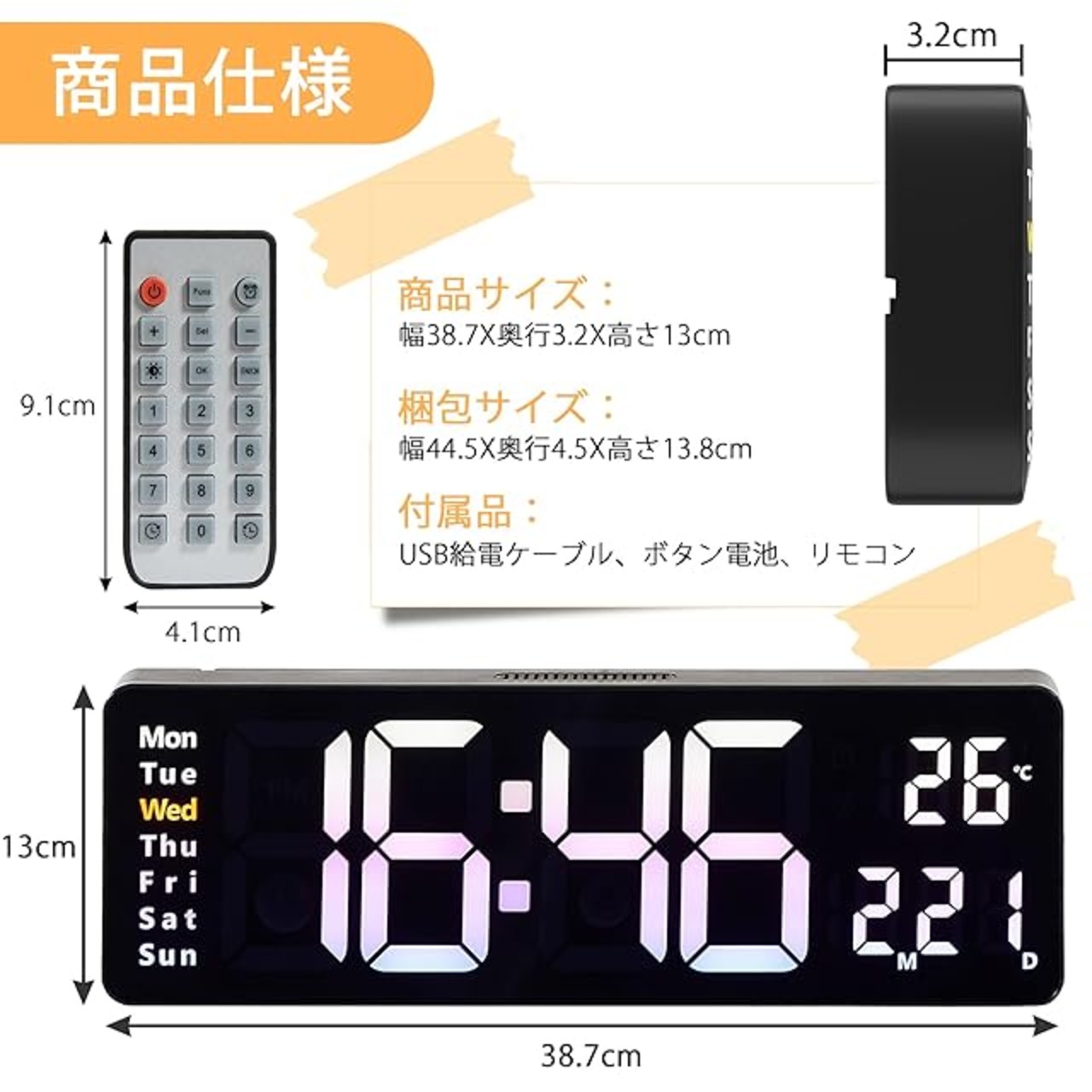 商品名:VECELO デジタル時計 幅38.7X奥行3.2X高さ13cm 16インチ usb給電 リモコン付き 明るさ自動感応 10段階明るさ調整 デジタル 壁掛け 日付 曜日 温度 日本語説明書 led 目覚まし 大音量 学生 子供 寝室 リビング キッチン 寝坊防止 ブラック