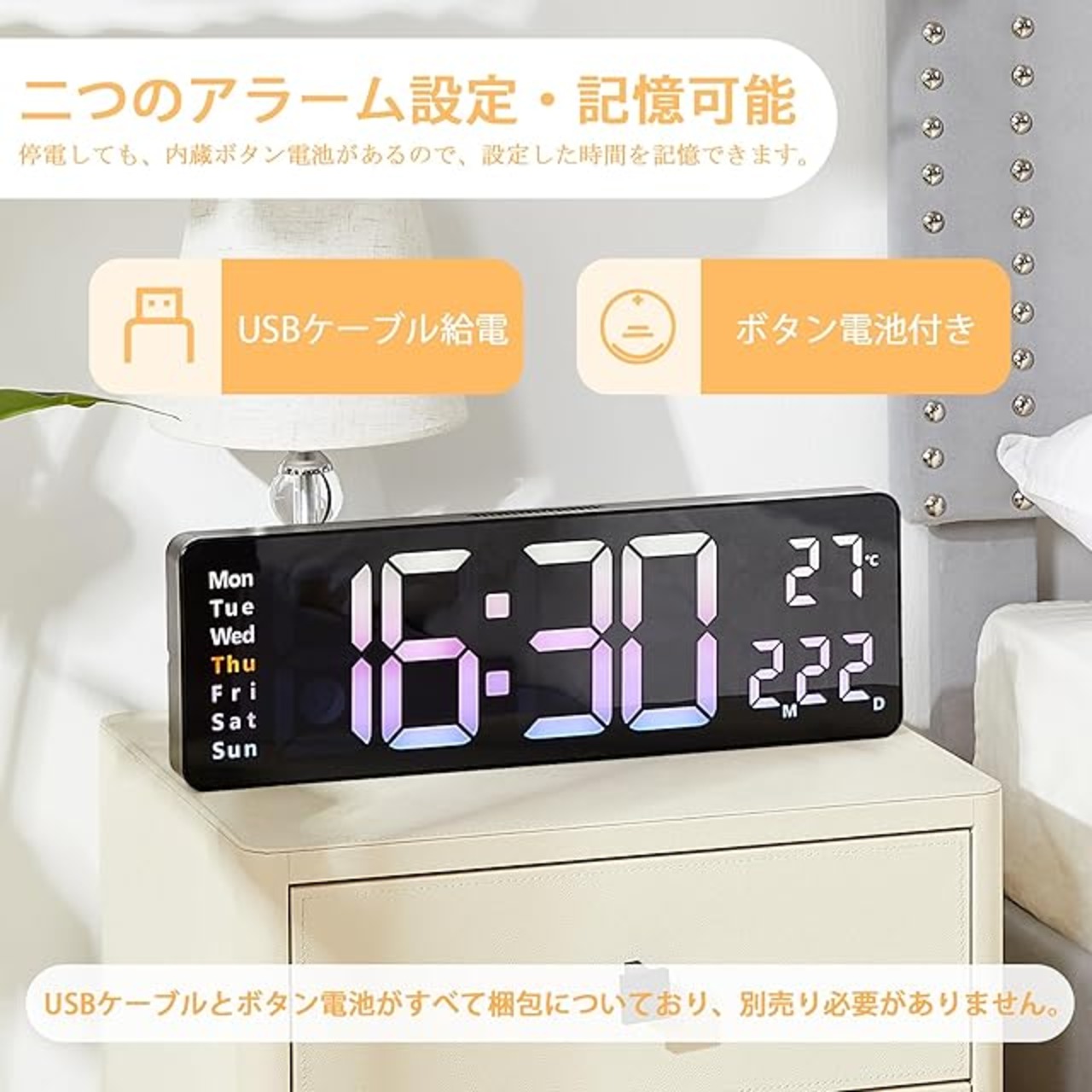 【二つのアラーム設定・USB給電可能】この電子時計は二つのアラームを設定でき、日常の目覚まし需要を満たせます。そのほか、この目覚まし時計はUSB ケーブルで給電します。停電が発生しても、内蔵ボタン電池があるので、設定した時間を記憶できます。