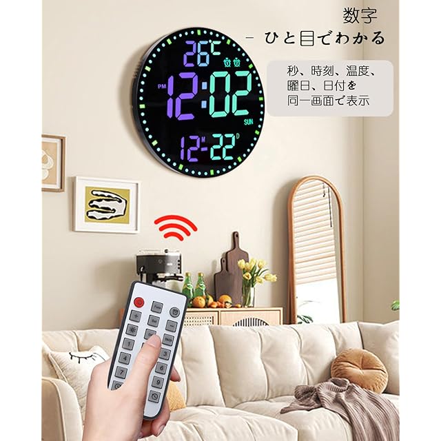 12インチ 大画面 LEDデジタル目覚まし時計12多色 リモートコントロール 多機能RGB壁掛け時計デスクアラームクロック寝室用 付き 明るさ調整可能/夜間ライト/正転·逆転タイマー/温度表示 /日付/曜日/目覚まし時計 - USBデータケーブルで駆動 (黒)