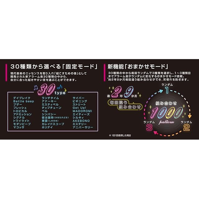 アラーム:大音量電子音。現代音楽のエッセンスを取り入れ「起こすための音」として開発された新アラーム音3 0 種類の中から、自分に合った起きやすい音を選ぶことができます。新機能「おまかせモード」:30種類の中から毎回ランダムで3種類を選択し、1~3種類目までアラーム音がランダムに変化するおまかせモード搭載。約2年9か月毎回違う組み合わせができ、耳慣れを防ぎます。組み合わせで1,000パターンのアラーム音が鳴ります。