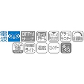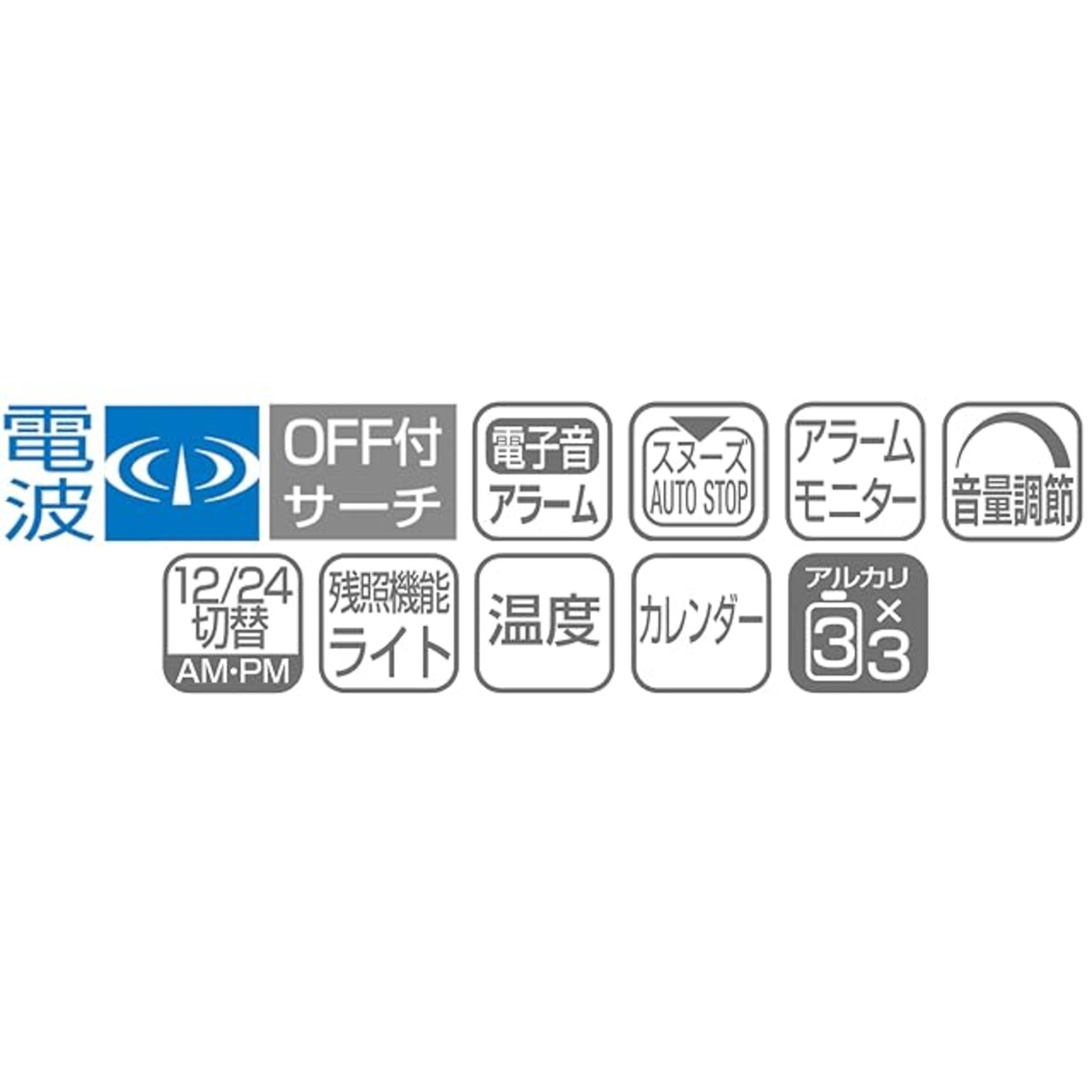 止めてもまた鳴るスヌーズ機能&アラームオートストップ機能。カレンダー、温度表示。音量調節ツマミ。12/24切換え表示。残照機能ライト付き。