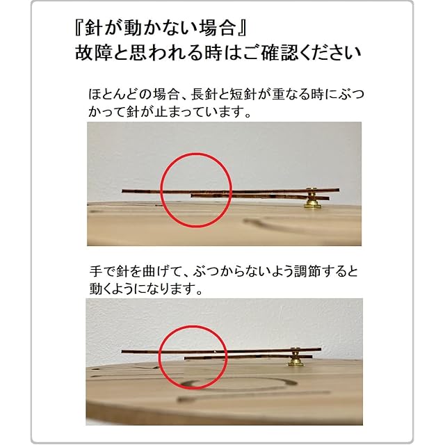 【動かない場合】※針が動かない場合は、ほとんどは長針と短針がぶつかって動かなくなっているのが原因です。12時ちょうどなどの針が重なる時間にあわせて横から見て確認していただき、手で針をぶつからないように調節していただくと直ることがあります。また、時刻を合わせる時には、直接針を回さずに裏面のダイヤルを回して時刻をあわせてください。(こちらも故障の原因となることがあります)