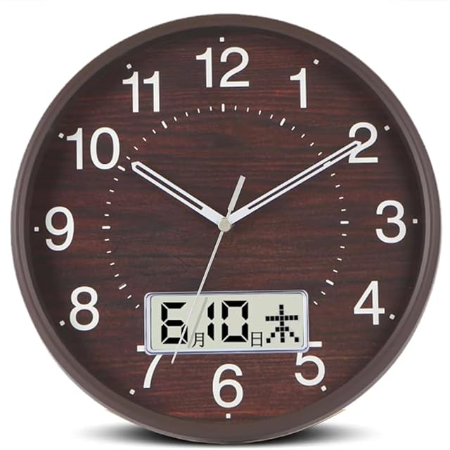 Nbdeal 掛け時計 電波時計 静音 連続秒針 直径35cm 大型液晶 日付 曜日表示 ブラウン DBKF-4837