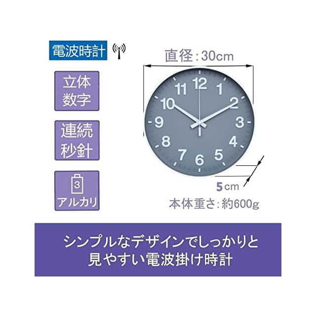 【機能】コチコチならない静かな連続秒針、電波受信機能 (自動受信/手動受信)、立体文字