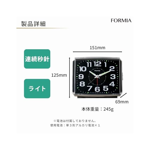 商品名:Formia(フォルミア) 置き時計 卓上 目覚まし 目覚まし時計 置き 見やすい 静音 連続秒針 電子音 スヌーズ アナログ 保土ヶ谷電子販売 ブラック HT-A023W-BK