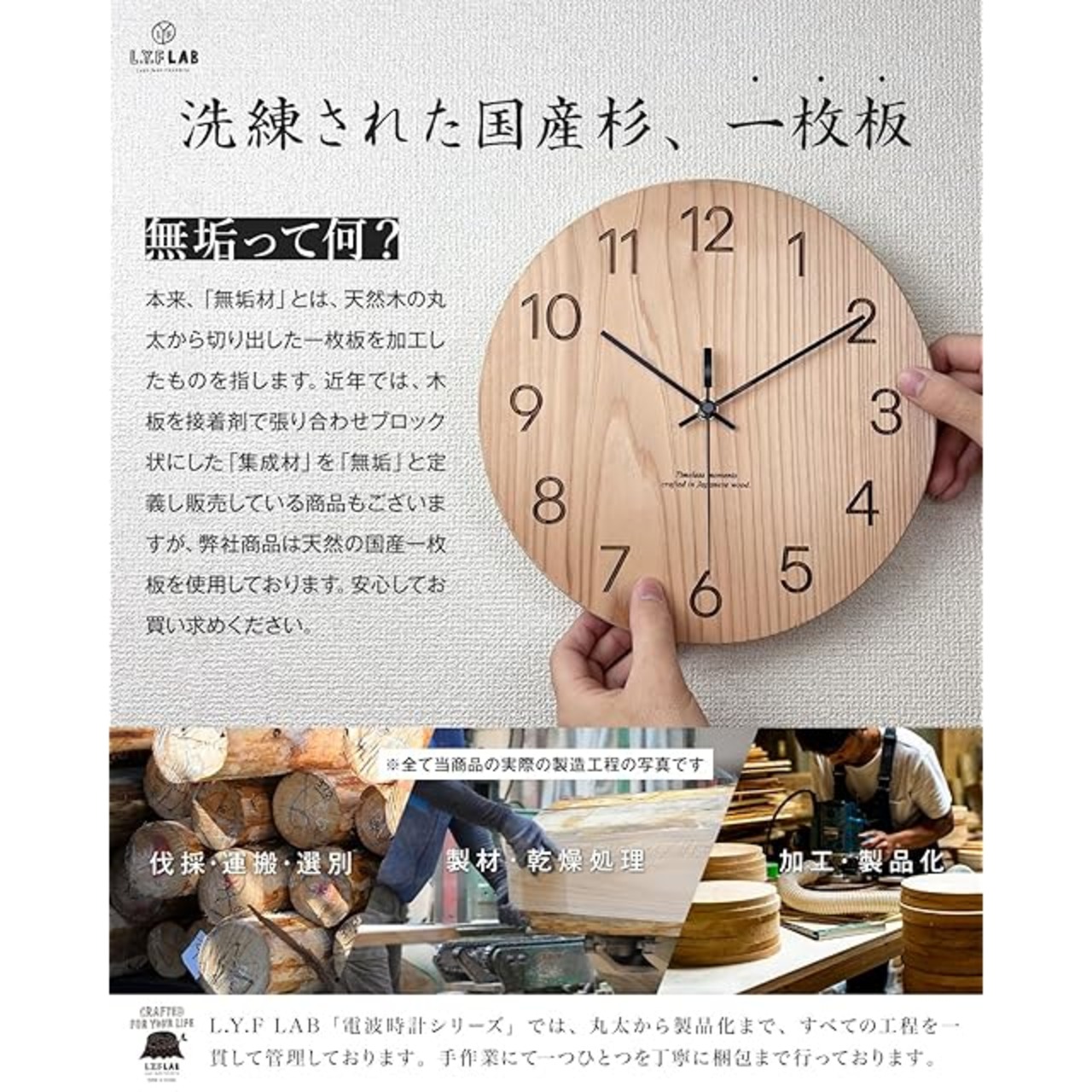 【 日本製 】掛け時計 電波 静音 国産 無垢材 【 職人手仕事の温もり 】 電波時計 壁掛け スイープ おしゃれ 木製 ナチュラル ギフト L.Y.F LAB 杉