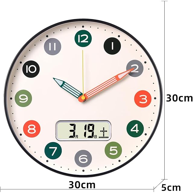 デュアルモジュール独立表示:30cmの大文字盤に鉛筆型針を採用、可愛いデザインで視認性抜群。独立したデジタルカレンダーモジュール(日付・曜日は手動設定、単3電池×2本必要)。