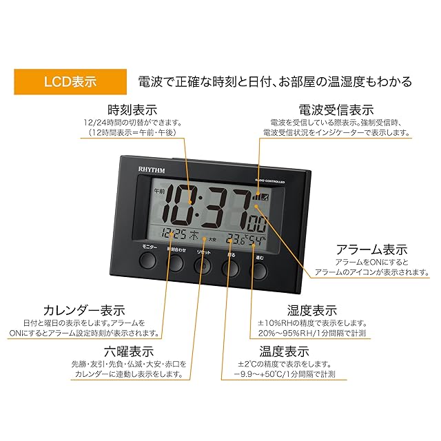 商品名:リズム(RHYTHM) 目覚まし時計 電波時計 温度計・湿度計付き フィットウェーブスマート 黒 7.7×12×5.4cm 8RZ166SR02