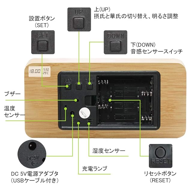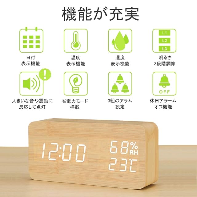【多機能目覚まし時計】①音感センサー:60db以上の音に反応して点灯、静かになると約10秒後に消灯。②アラーム:アラームが三つまで設定可能。③3段階輝度調節:お好みで明るさ調節、省エネと共に目に優しい。④ダブルディスプレイ:12/24時間表示、時刻/カレンダー/温度表示/摂氏表示と華氏表示切替。湿度(±3%RH) 温度(±1℃)⑤設定記憶:電源が絶たれても、記憶機能で再設定不要。⑥二種の給電方法:USB給電と乾電池