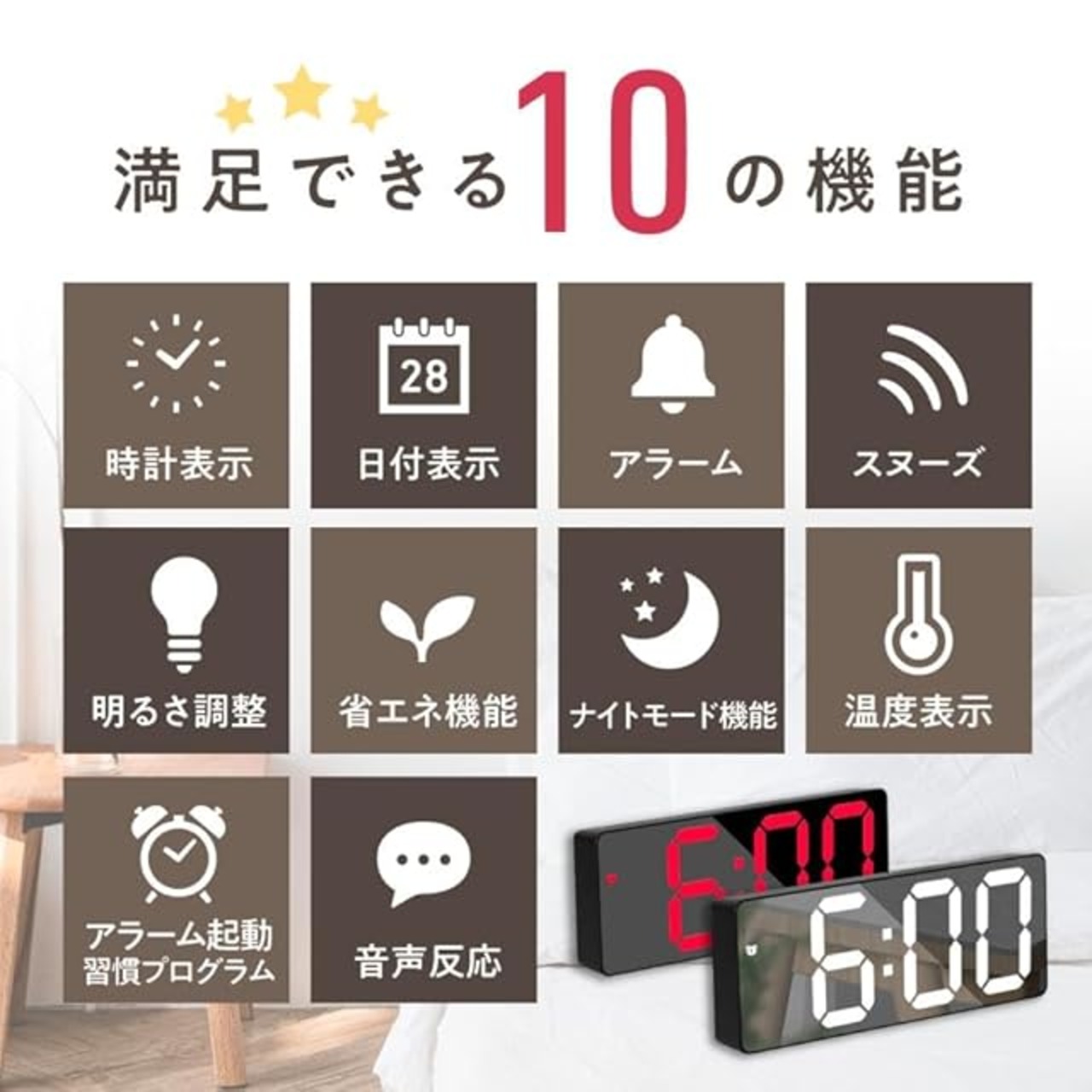 ✅【多機能搭載で生活をサポート】時刻・日付・温度表示、アラーム、スヌーズ、明るさ調整、省エネモード、音声反応、ナイトモードなど便利な10機能を搭載。