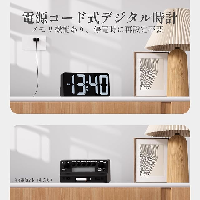 【バッテリーバックアップ】停電時に時刻とアラーム設定を確実に保持するため、事前に予備用の単4電池2本(別売り)を入れ、バックアップ機能を有効にしてください。電源コード式ですので、付属のケーブルを通って100-240V ACコンセントに差し込んでからご利用ください。