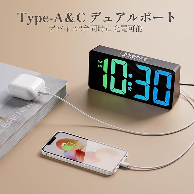 ①8色ディスプレイ:単色4種&ダイナミックRGB 4種。<br><br>②7色ナイトライト:単色4種&ダイナミックRGB 3種。<br><br>③明るさを自由に設定でき、どんな環境でもはっきり見える。<br><br>④7段階調整できボリューム、最大118dB大音量ブザー、朝が弱い人におすすめ!<br><br>⑤12時間/24時間表示を切り替え、DSTモード付きます。<br><br> ⑥大きいなデジタルディスプレイ、時間が読みやすい。<br><br>⑦スヌーズ機能あり、二度寝防止に最適!<br><br>⑧アラーム一度設定したら、自動的に再設定できます。<br><br>⑨記憶機能あり、停電時リセットする必要ありません。<br><br>⑩Type-A&C ダブルポート搭載、スマホ2台同時に充電可能。<br><br>⑪操作簡単、お年寄りも子供も使いやすい。<br><br>⑫シンプルでおしゃれなデザインで、ちゃんと部屋の雰囲気に馴染む。<br><br>⑬安心サポート:18ヶ月製品長期。<br><br>