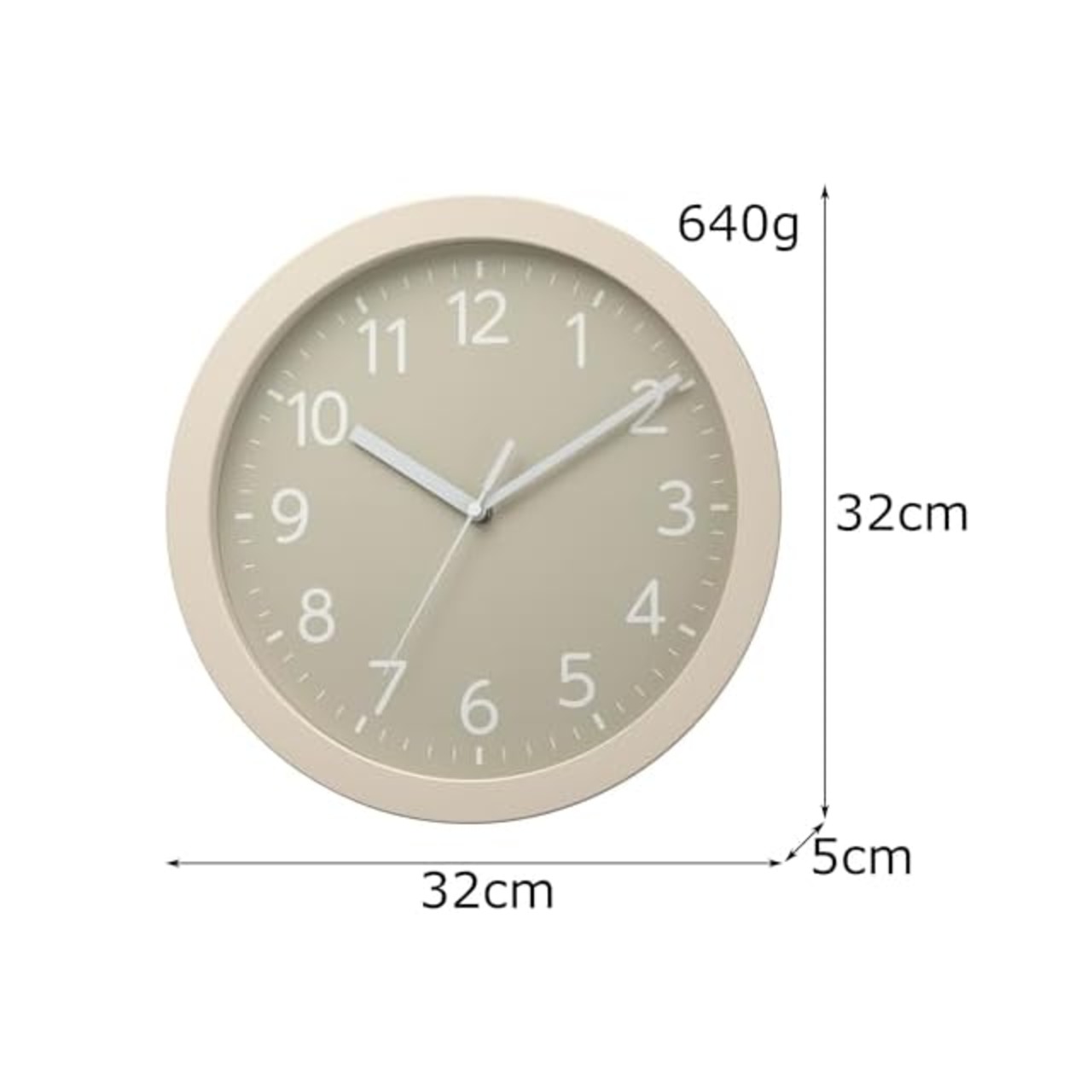 サイズ:32×32×5cm 質量:640g 使用電源:単3形アルカリ×1本(電池別売)材質:プラスチック枠/ガラス風防 ムーブメント:クオーツ 秒針:連続秒針(スーッと滑らかに動く)文字板:ユニバーサルデザインフォント使用