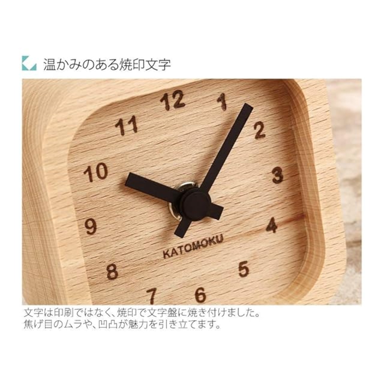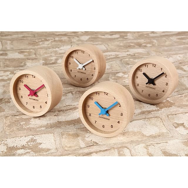 【商品説明】仕事の机からお子さんの勉強机まで多くの場面で使っていただきたく、針のカラーバリエーション豊富な時計になりました。文字盤は印刷ではなく、レーザー加工でもなく「焼印」で焼き付けました。レーザー加工では表現できないアナログな焦げ目、そしてプレス時にできてしまう凹みが、味わい深く、小さくても魅力たっぷりな時計です。