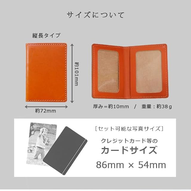 国産皮革の栃木レザー社製「アニリンレザー」を使用したカードサイズのフォトフレームです。 使い始めは表面に張りのあるハードタイプの革ですが、徐々に柔らかくなじんでゆきます。 経年変化で色味も深まり艶も増していく味わい深い革です。 カードサイズのフォトフレームにはクレジットカード大の写真を収納することができます。タテ長タイプはタテ長の写真を入れて、飾れるので旅行や出張の際に大切な写真を持ち運ぶのに便利です。また、ICカードや定期券などと一緒に大切な写真を持ち歩くこともできるためプレゼントにも人気のアイテムです。