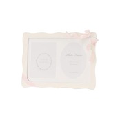 緩やかなフォルムが素敵なL判×2面のフォトフレームです。立体的で躍動感のあるリボンをポイントにあしらいました。まるでプレゼントにリボンをかけたようなデザインで、特別感のある雰囲気を盛り上げてくれます。2窓タイプのシート付きなのでシートを用いてサービスサイズの写真を2枚飾ることが可能。シートを外してキャビネサイズとしても使用でき、大きめの写真を飾りたい時にもぴったりです。棚やデスクの上に置いて飾れるベーシックなスタンド仕様。ご自宅用にはもちろん、結婚祝いや出産祝いのギフトとしても喜ばれる1品です。カラーはピンク、ブルー、アイボリーの3色をご用意しています。<br><br>*中に入る写真のサイズ/8.9×12.7cm(2L版/12.7×17.8cm)