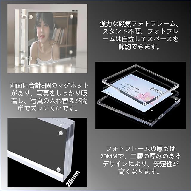 <p>強力な磁気設計</p> <p>スタンド不要で、磁石によって独立して立つことができます。</p> <p>両面には8つの強力な磁石があり、写真をしっかりと吸着させ、取り替えが容易でかつ移動しにくいです。</p> <p>高品質なアクリル素材</p> <p>20mmの厚みがあり、ダブルレイヤーで強化されたアクリルフレームは、高級感があり、安定感が抜群です。</p> <p>透明度が高く、クリスタルのような透明感があり、視覚的に鮮明で、伝統のガラスフレームよりも丈夫で耐久性があります。</p> <p>写真のディスプレイオプション</p> <p>横置きまたは縦置きの選択が可能で、様々なスタイルの写真に対応できます。</p> <p>アクリル磁気フレームは家族写真、名刺、標本花など、多岐にわたる用途に対応しています。</p> <p>精緻な製作</p> <p>フレームには保護フィルムが付いており、傷を防ぎ、美しさを長く保ちます。</p> <p>直角のデザインと立体感のある角があり、水跡がなく変色せず、環境にも安全です。</p> <p>多様な使用シーン</p> <p>家庭、オフィス、宴会、休暇など、様々なシーンに適しています。</p> <p>自分用や贈り物としても利用可能です。</p> <p>優れたアフターサービス</p> <p>30日間の返品と交換がサポートされ、購入者の満足度が保障されています。</p>