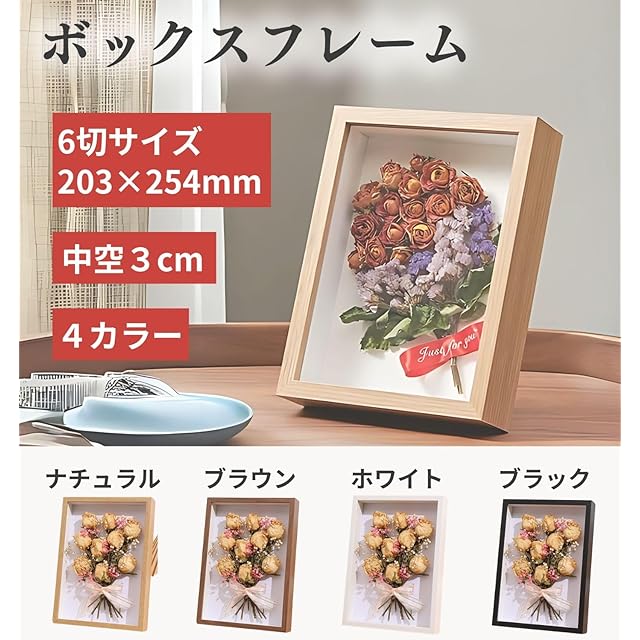 【立体展示で魅せる】奥行き約3cmの中空構造で立体感を引き立てるボックスフレーム。お好みの写真やドライフラワー、押し花、立体アート、フィギュアなどを入れて飾る額として最適です。ホコリを防ぎながら作品を美しく展示できる立体フレーム。6切(203×254mm)サイズ対応で、インテリアディスプレイやメモリアルケースとしても活躍します。</br>【木の温もり素材】フレームは木目調の温かみあるデザイン。お部屋のテイストに合わせて選べる4色(ホワイト・ブラック・ブラウン・ナチュラル)をご用意。ナチュラルインテリアや北欧風のお部屋にも馴染みます。ドライフラワー フレームやフラワーフレームとして、自分好みにアレンジして飾るのもおすすめです。</br>【縦横どちらもOK】縦置き・横置き両対応で、自立式としても使える2WAY設計。棚やデスクに置くだけで空間をおしゃれに演出できます。A4サイズのボックスフレームよりやや小さめの6切サイズで、厚みのある額縁構造が特徴。写真・アート・立体作品など、お好きなアイテムを自由にレイアウトできます。</br>【壁掛けも可能】背面に吊り金具付きで、壁掛け・卓上どちらでも使える便利な仕様。ワンルームやショップの装飾にもおすすめです。額縁 厚みありタイプで、押し花・立体写真・ドライフラワー 額縁として使用すれば、お部屋をギャラリーのように華やかに彩ります。</br>【ギフトにもおすすめ】透明カバー付きで中の作品をしっかり守ります。お気に入りのドライフラワーや思い出の品を入れて贈れば、心のこもったギフトに。フラワーボックスのようにアレンジが楽しめるボックスフレーム単体で、創作やディスプレイの幅が広がります。