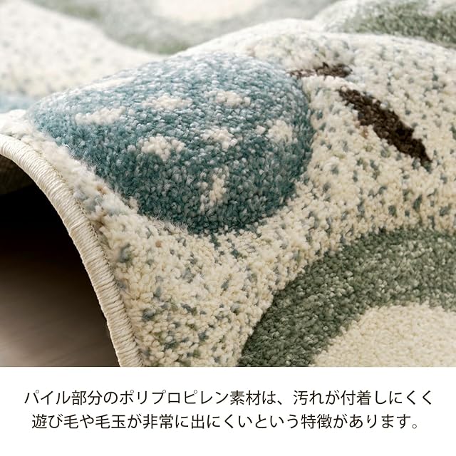 【汚れに強い】パイル部分に使用しているポリプロピレン素材は、汚れが付着しにくく、遊び毛や毛玉が非常に出にくい特徴があります。又、横糸には麻糸を使用しており、麻の持つ抗菌防臭、消臭効果で臭いも気になりにくいです。