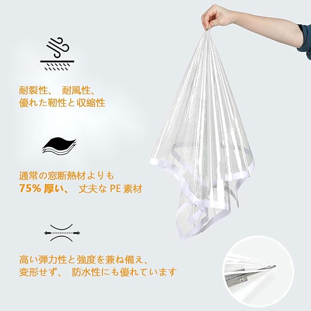 通常の窓断熱材よりも75%厚い、丈夫なPE素材で作られています。耐裂性、耐風性、優れた靭性と収縮性を持ち、高い弾力性と強度を兼ね備え、変形せず、防水性にも優れています。冬は暖かく、夏は涼しい室内環境を保ち、取り付け時のしわが少なく、熱収縮処理は必要ありません。