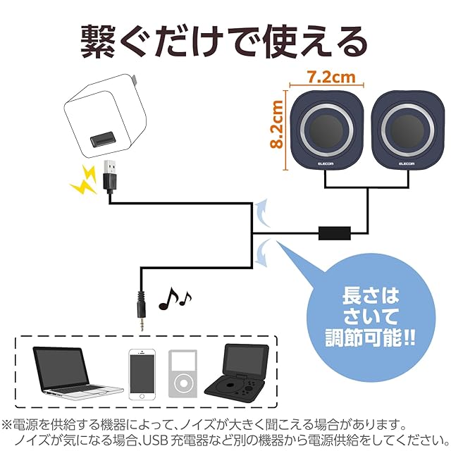 汎用性の高い3.5mmステレオミニジャック接続の入力タイプなので、パソコンだけでなく様々な機器に接続可能です。