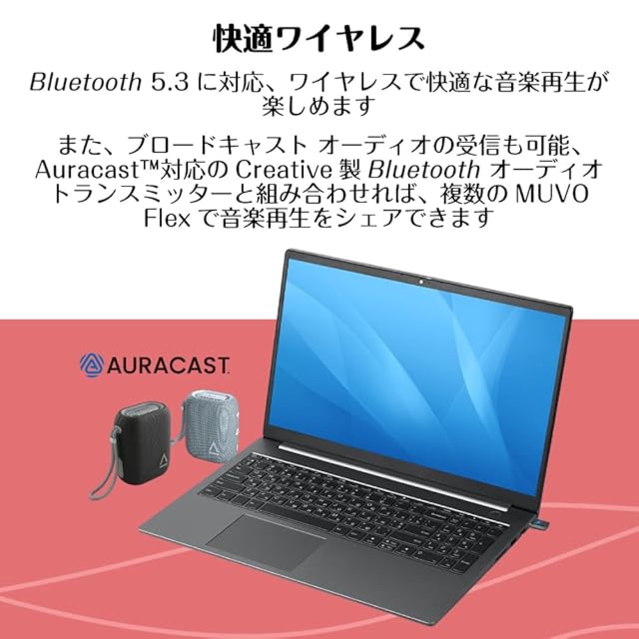 ブロードキャスト オーディオの受信も可能で、Auracast(TM)対応のBluetooth オーディオ トランスミッター Creative BT-W6と組み合わせれば、複数のMUVO Flexで音楽再生