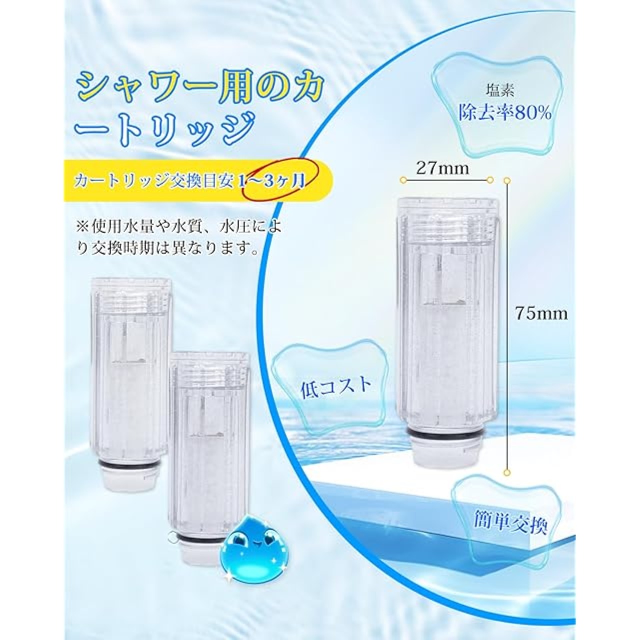 定期的な交換で効果を持続:交換の目安は約1〜3ヶ月。使用頻度や水質によって異なりますが、交換のサインは水圧の低下や塩素除去効果の減少です。定期的な交換により、常に快適なシャワー体験をお楽しみいただけます。