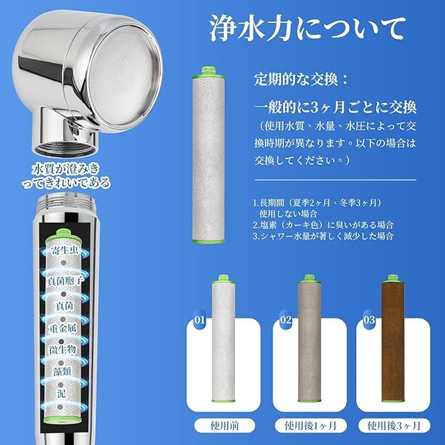 【浄水能力】シャワーカートリッジは不織布と活性炭繊維で構成されている。ACF活性炭繊維は、最大99.9%の残留塩素をフィルタリングすることができ、効果的に不純物、錆、重金属を除去し、従来の活性炭吸着性能に比べて水質を柔らかくする10倍高くなっています。 高度に不織布は、効果的に細菌、不純物、有機汚染物質をフィルタリングすることができます。