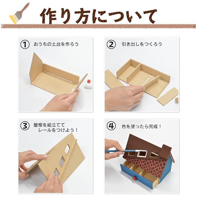 【貯金箱工作 ちょっ金ハウス】<br><br> 自由工作に最適なちょっ金ハウス。<br> はめ込み加工済みのMDF板で誰でも簡単に短時間制作が可能です。<br> 制作時間は約2~3時間!<br> ちょっと物足らない人は、木部の周りに粘土をデコレーションしよう!<br><br> ■仕上がりサイズ(約):縦167×横192×奥行113(mm)<br><br> ■セット内容<br> 〔えんとつ用(コイン投入口)〕<br> 板…2<br> 角棒…(長)1(短)1<br> 〔屋根用〕<br> 前板…1<br> 後板…1<br> 角棒…1<br> 〔家用〕<br> 側板…2<br> 背板…1<br> 底板…1<br> 〔引き出し用〕<br> 側板…2<br> 前板…1<br> 後板…1<br> 底板…1<br> 仕切り板…2<br> 木玉フック…1<br> 〔共通〕<br> 木工用木工用接着剤…1<br><br> ■材質:MDF<br>