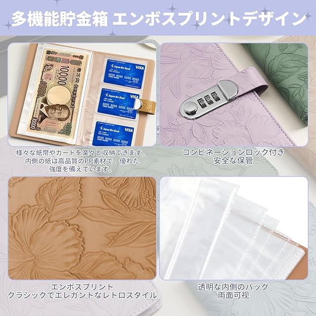 happykau お札 貯金箱 お金仕分け 貯金バインダー 大容量 コンビネーションロック 便利な収納 貯金 ファイル バインダー 透明な内袋お札 封筒貯金 大人と子供向け おしゃれ 内側のページ 仕事 通勤