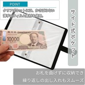 【丈夫なつくり】透明ポケットはお札を曲げずに収納でき、繰り返しの出し入れもスムーズに行えます。本体表紙は合成レザー調で柔軟性があり、スタイリッシュ。防水性のある材質で、お札をしっかり守ります。