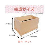 【さいせんばこ】<br> ・賽銭箱型の貯金箱が作れる木工工作キットです。<br> ・工具を使わず、付属の木工用接着剤で簡単に組み立てることができます。<br> ・小学校のイベント・お楽しみ会・お正月の製作にもおすすめです。<br> ・子ども会・地域のお祭り・縁日にも!子どもから大人まで楽しく手作りできるキットです。<br> ・集客イベントの景品や工作コーナーでのワークショップに最適です。<br> ・初詣ごっこにもおすすめです!<br> ・ イベント・季節行事・知育にぴったりです。<br> ・夏休みの自由工作として提出できます(※学校の規定で工作キット使用不可の場合は提出できません)<br> ・手軽に作れる手作り賽銭箱で、楽しい思い出を作りましょう!<br><br> ■完成サイズ<br> (約)高さ92×横155×奥行95(㎜)<br><br> ■セット内容<br> ・木部セット ・・・・・・・1<br> ・ふた(コイン取出口)・・・1<br> ・紙やすり ・・・・・・・・1<br> ・木工用接着剤 ・・・・・・1<br><br> ■材質<br> MDF<br><br> ■作るときに必要な道具<br> ・テープ<br> ・画材<br><br> ■制作に必要な時間<br> 約1時間~(組立て:約20分)<br>
