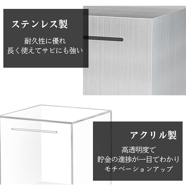 【インテリアとしても、貯金箱としても】部屋のアクセントとしても活躍するエレガントな正六面体デザイン。耐久性に優れたステンレス製は、長く使えてサビにも強い。一方、高透明度のアクリル製は貯金の進捗が一目でわかり、モチベーションを高めてくれます。どちらの素材も、インテリアとしての美しさと実用性を兼ね備えています。お好みに合わせてお選びください。