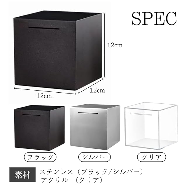 【商品詳細】サイズ:12cm ×12cm × 12cm 素材:ステンレス / アクリル カラー:ブラック/シルバー/クリア ※お金を取り出す際には、ハンマー、軍手、保護メガネをご用意し、安全を最優先に作業してください。・屋外など安全な場所で行うことを推奨します。・大きな音がする可能性がありますので、時間帯を考慮ください。