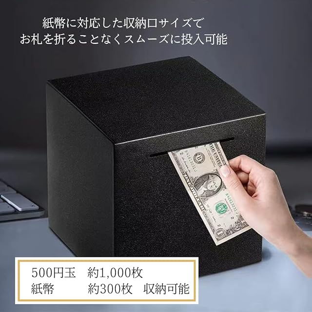 【札も心も折らない】お札も折れず、そのまま美しい状態で貯金。紙幣に対応した収納口のサイズで、お札を折ることなくスムーズに投入可能。取り出したときも、入れたときと同じピカピカの状態が保たれます。500円玉なら約1,000枚、紙幣なら約300枚収納可能。大容量設計で、目標の◯◯万円も夢ではありません。