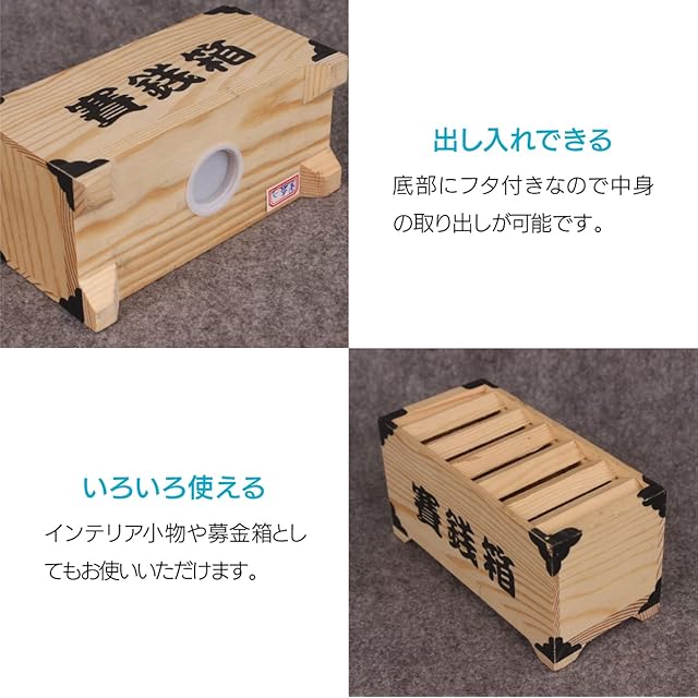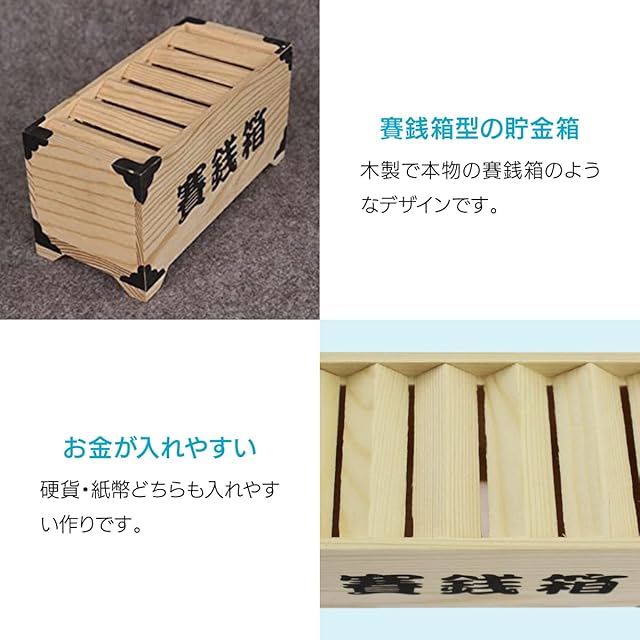 賽銭箱型の貯金箱です。木製で本物の賽銭箱のようなデザインです。<BR> 硬貨・紙幣どちらも入れやすい作りです。底部にフタ付きなので中身の取り出しが可能です。<BR> ユニークなデザインなので、貯金箱としてはもちろん募金箱としてもお使いいただけます。<BR> 【仕様】サイズ:W15cm×D7cm×H8cm / 材質:木 ※モニターの環境等により、色の見え方に若干差が生じる場合がございます。<BR> ENN LLCは、当社オリジナルパッケージにてお送りし、30日の返品で安心して購入いただけます。