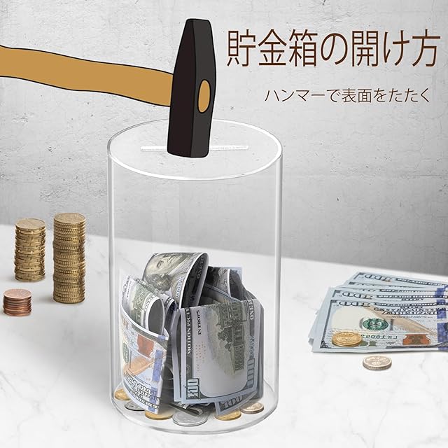 大容量貯金箱:透明度の高いアクリル素材を使用し、お金を守るための堅牢性を備えたクリアタイプのマネージャーです。 寸法:直径12×高20cm、満杯の場合、約1,800枚の硬貨または500枚の紙幣を収納可能