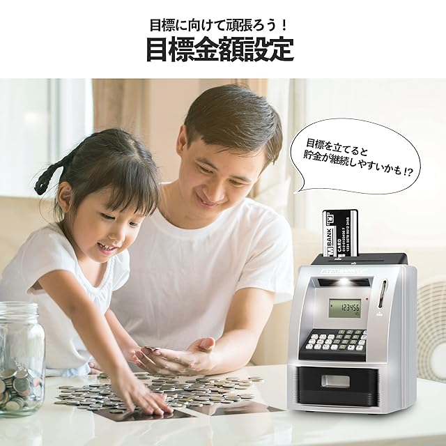 【メイン機能】■硬貨の児童識別 ■貯金の目標設定 ■残高の自動計算 ■時刻表示・アラーム機能 ■電卓機能 ■サウンド搭載(ON/OFF切り替え可能)【その他の機能】■ライトの点灯 ■金額表示部分の液晶モニター