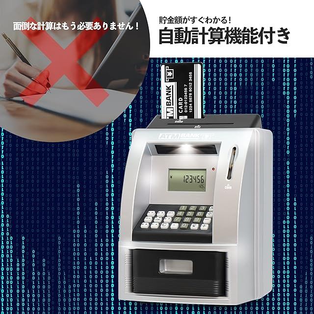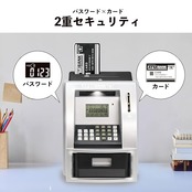 商品名:YSN ATMバンク 銀×黒 | BANK 残高 自動計算 時刻表示 アラーム 電卓 目標額の設定が可能 サウンド搭載 硬貨 自動識別 パスワード カード ダブルセキュリティー 多機能 ATM型 貯金箱